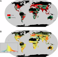 Figure 1: Global distribution of cropping and grazing in 2010 from (A) HYDE v3.2 and (B) modeled SOC change in the top 2 m. Source: Sanderman et al. (2017), PNAS